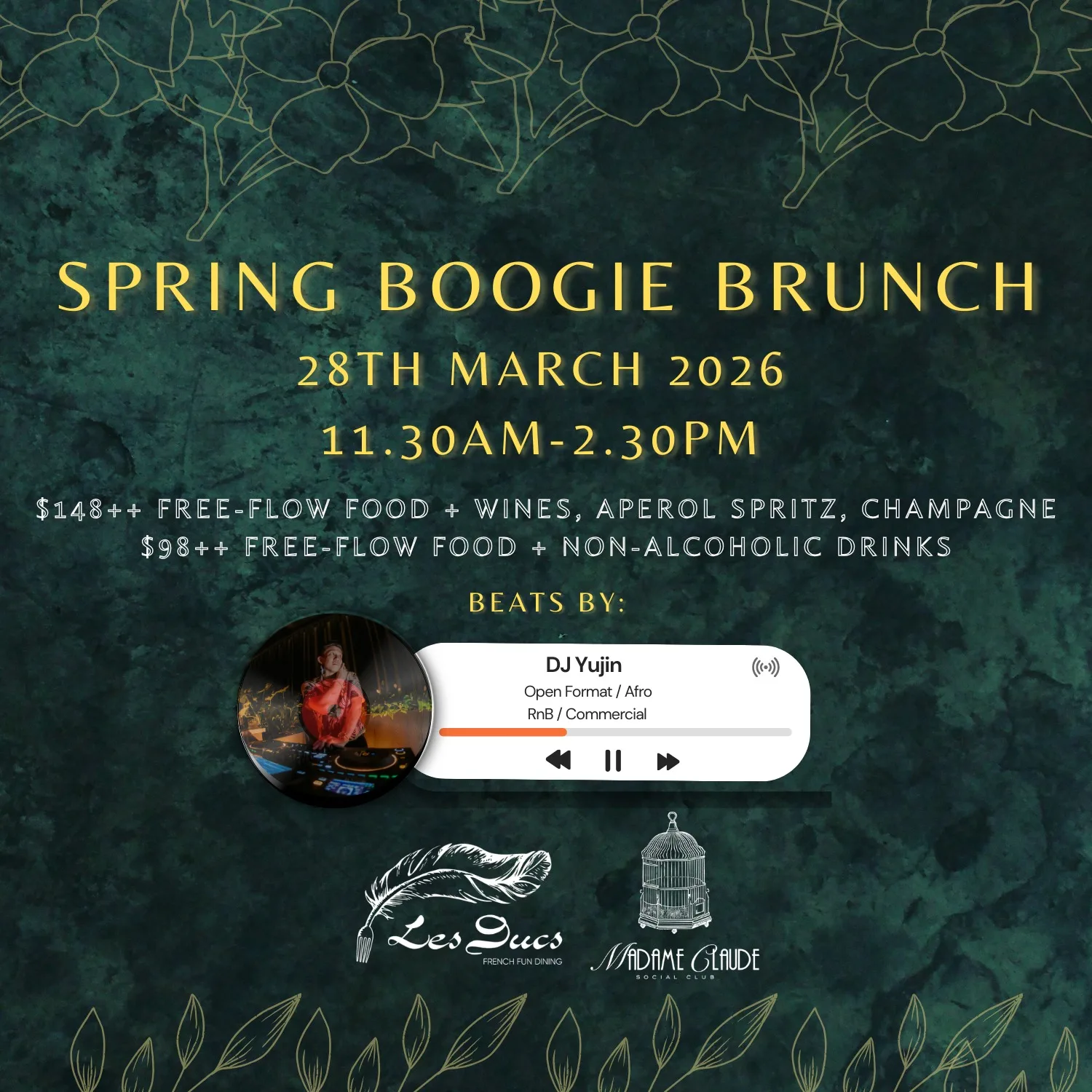 Get ready to sip, sway, and celebrate at Boogie Brunch! Enjoy Free Flow Buffet, Bubbles, Wines & Selected Cocktails from 11.30 AM to 2 PM across 3 floors while grooving to the best beats. Then keep the energy going with DJ Yujin featuring RnB / Commercial Open Format / Afro Beats at Madame Claude until 5 PM. ๐โจ๐พ